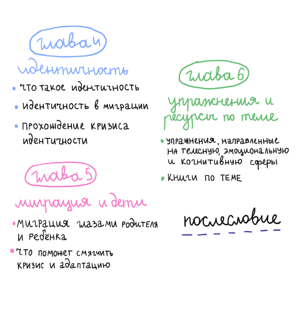 Идея была в том, чтобы книга создавала ощущение процесса, каким есть миграция: сначала мы переживаем стресс и потери, стараемся, злимся и разочаровываемся, боремся с реальностью. После приходит переосмысление произошедшего, и мы интегрируем эти события в нашу картину мира. В конце концов, принимаем факт изменений, находя в себе ресурсы действовать и жить дальше.